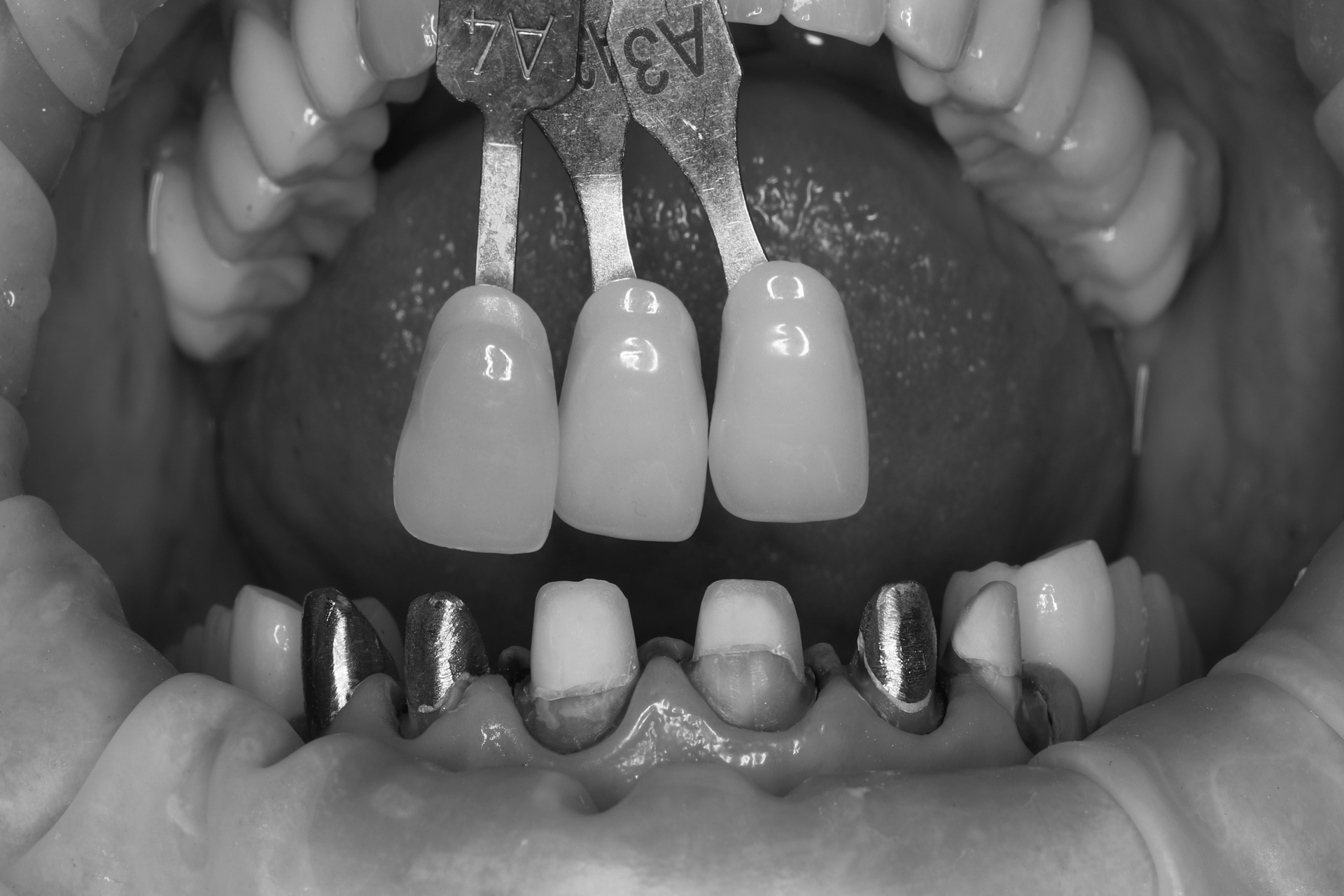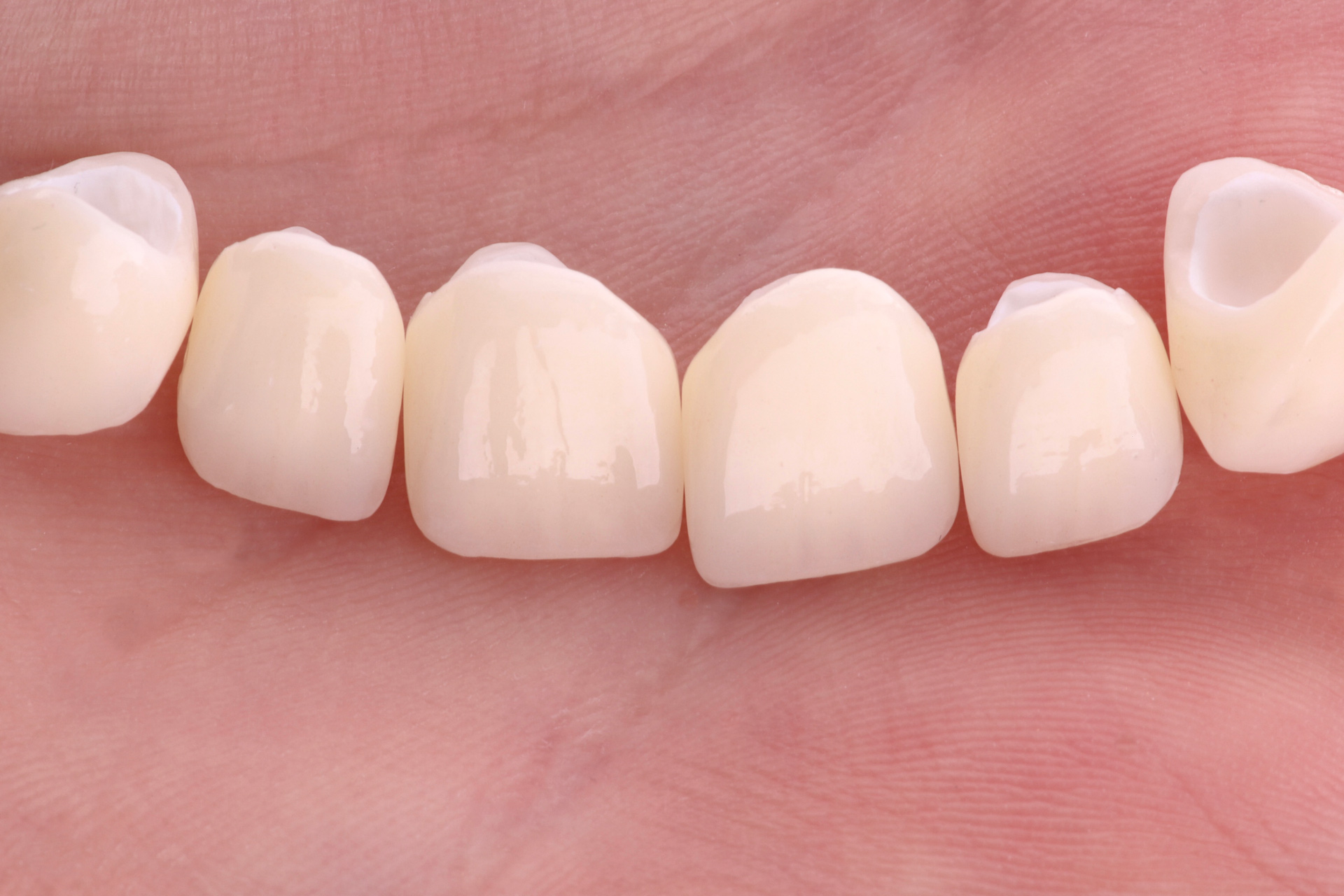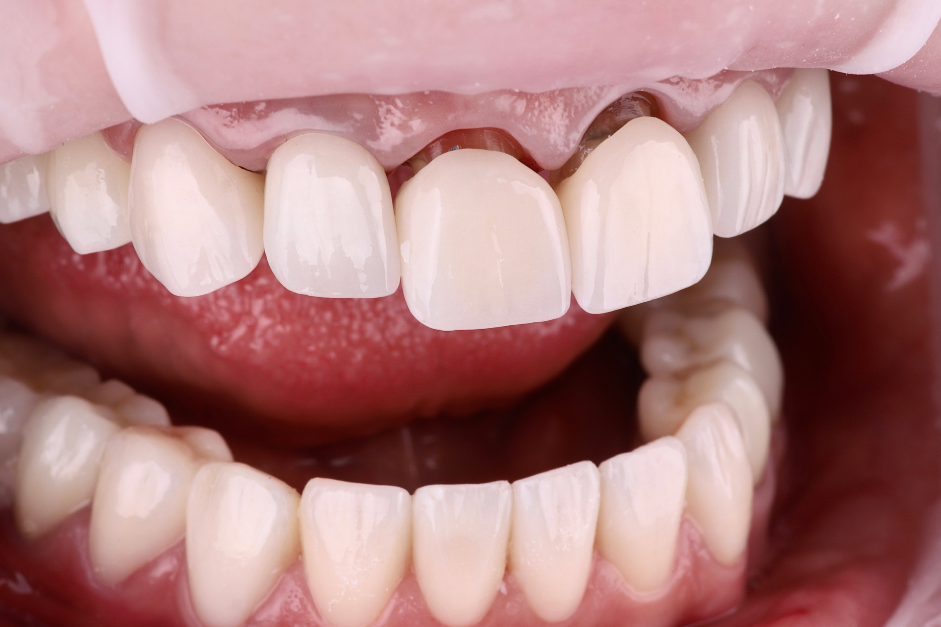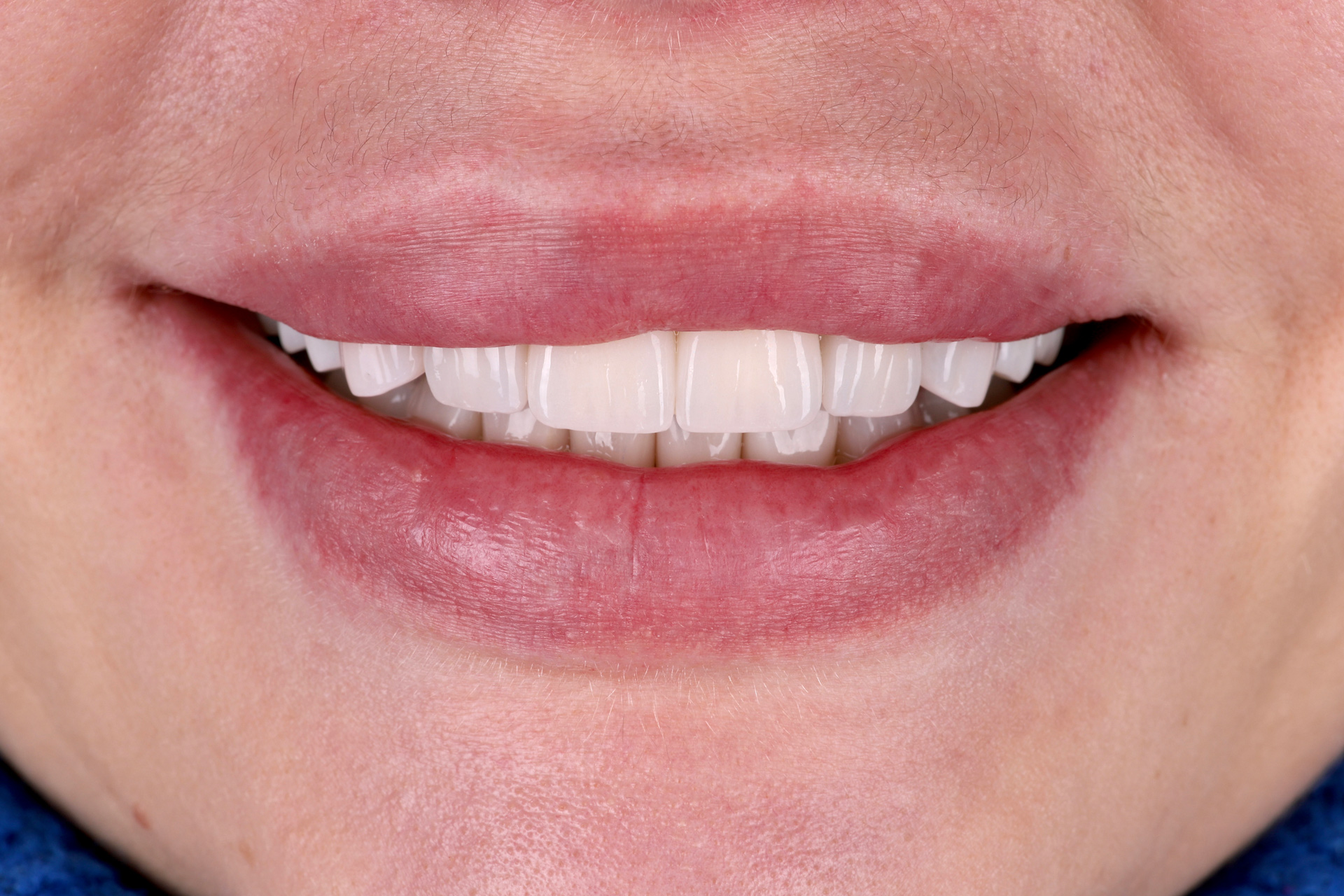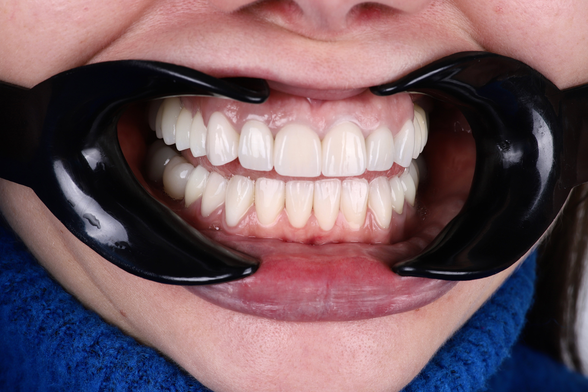 І настала війна… Після 1,5 року ми зустрілись знову. А частини тимчасових зубів вже не було, але положення щелеп та імплантанти збереглись. Тому дуже швидко перевели роботу з тимчасових коронок на постійні. Загалом було встановлено всі види ортопедичних конструкцій: коронки, вініри та керамічні накладки.